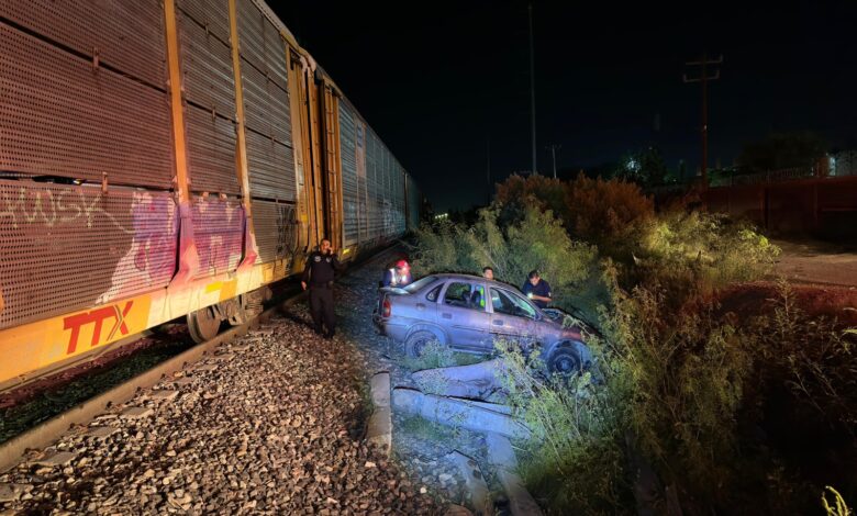 Por poco y no la cuenta el conductor de un automóvil, ya que al parecer intentó ganarle el paso al tren que lo embistió varios metros en la carretera estatal Los Pinos.